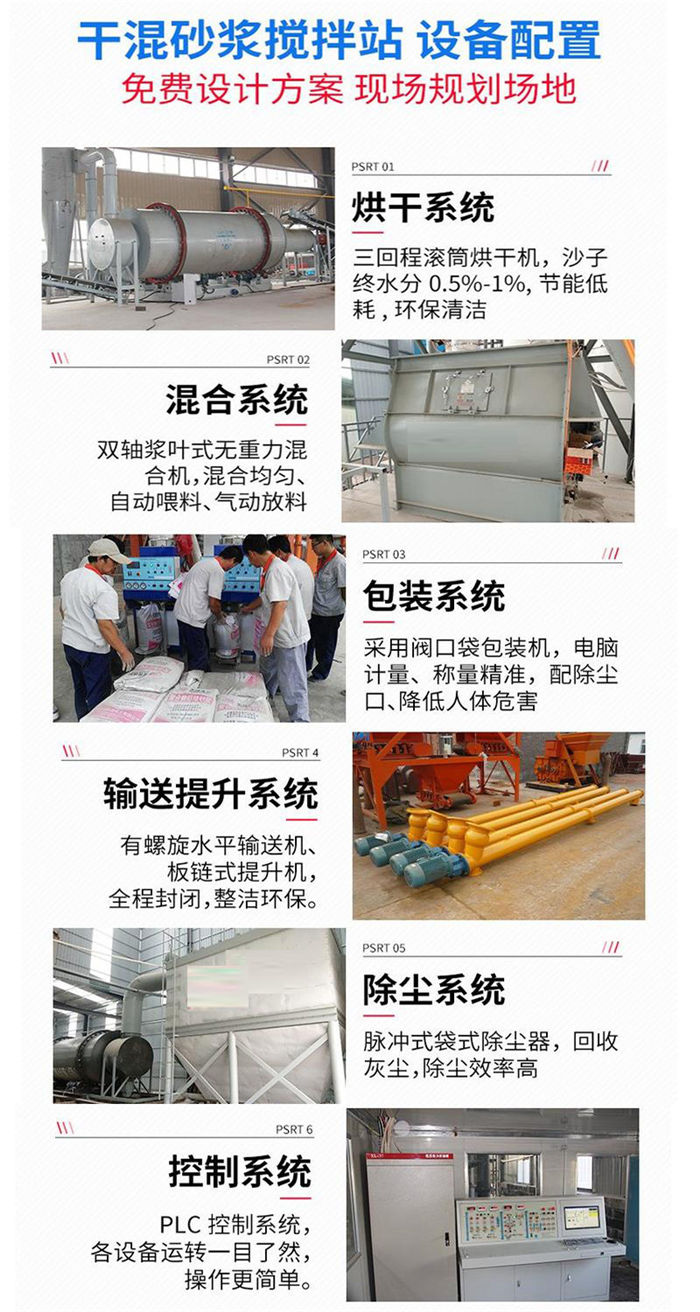 該套生產(chǎn)線由砂子烘干系統(tǒng)及預(yù)拌砂漿混合系統(tǒng)兩部分組成。主要包含:砂子烘干系統(tǒng)、篩分輸送系統(tǒng)、原料儲(chǔ)存系統(tǒng)、高效混合系統(tǒng)、自動(dòng)配料系統(tǒng)、氣動(dòng)平衡系統(tǒng)、除塵系統(tǒng)、袋式包裝系統(tǒng)、散裝罐車專業(yè)包裝系統(tǒng)以及PLC自動(dòng)控制系統(tǒng)等。